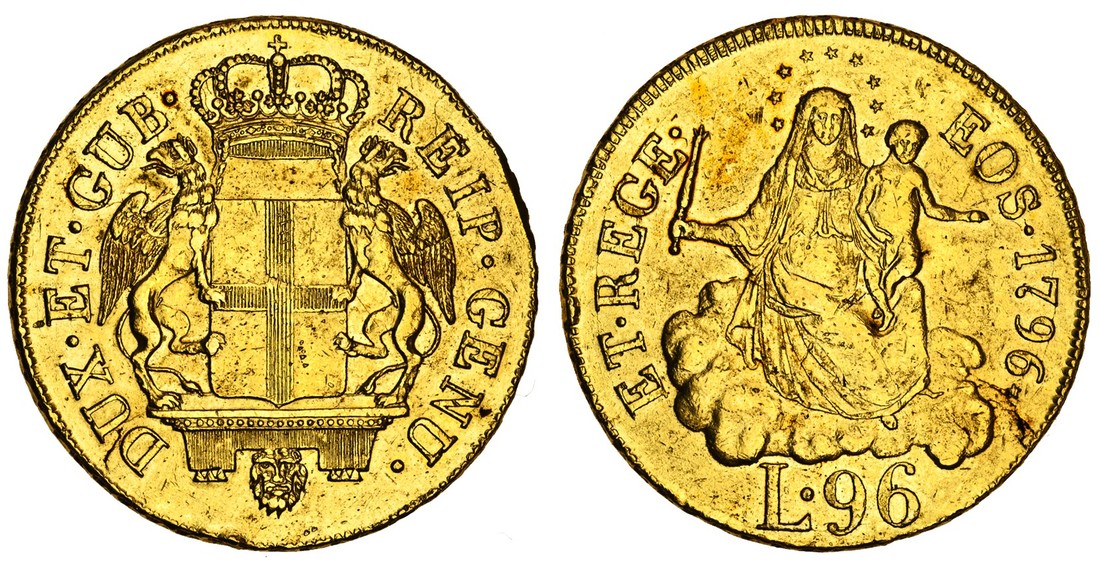 Italy, Genoa, 96-Lire, 1796, crowned arms, rev. Madonna and Child (F.444; KM 24.2; Lun.360), some marks on edge, very fine