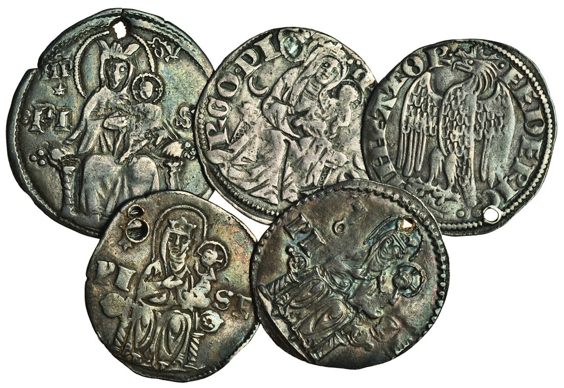 Italy, Pisa, in the name of Federico II (1313-1406), Grossi of 2-Soldi (2), 1.63g, mint mark bell (MIR.410/5), and 1.55g, mint mark crescent (MIR.410/6), both pierced, good fine Republic, Grosso of 2-Soldi, undated (c.1270), 3.056g, large crowned eagle (MIR.397), and later Grossi of 2-Soldi (c.1296-1312) (2), small eagle, mint mark bell (MIR.405/2), and key (MIR.405/7), all pierced, very fine (5)