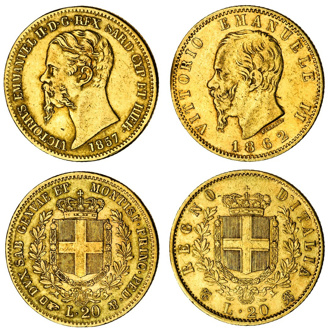 (g) Italy, Sardinia, Vittorio Emanuele II (1861-78), 20-Lire, 1857 Turin (F.1146), and Kingdom of Italy, 20-Lire, 1862, Turin (F.11), marks on edge, good fine (2)