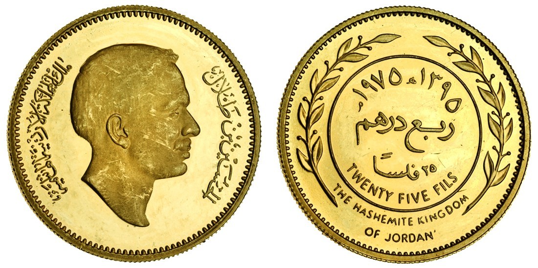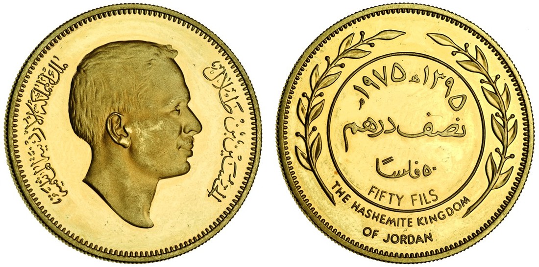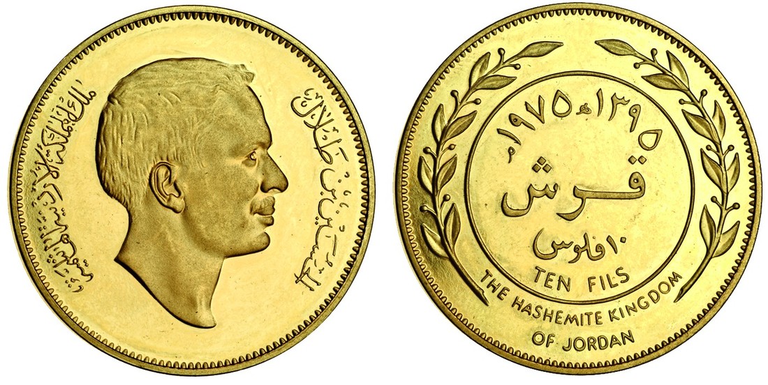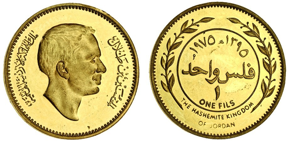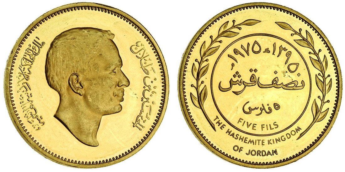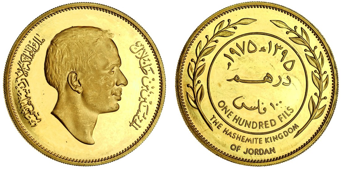 (x) Jordan, Hussein Ibn Talal (1952-99), proof pattern set in gold (total weight 82.79g) of the 1975 currency coinage, 100-, 50-, 25-, 10-, 5- and 1-Fil, AH1395, head right, rev. inscription, egde plain (KM PN7-12), uncirculated, only 112 of each denomination struck, extremely rare as a set (6)