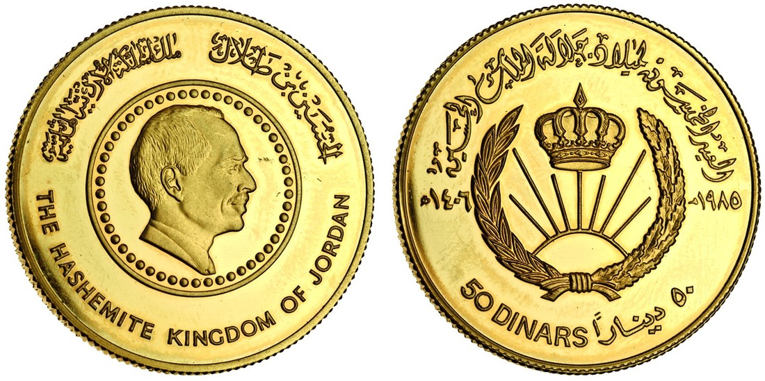 (x) Jordan, Hussein ibn Talal (1952-99), proof piefort 50-Dinars, 1985, 34.07g, head right, rev. crown in wreath, edge milled (KM P3), uncirculated, rare, 700 struck, most of which were melted, about 100 pieces remain