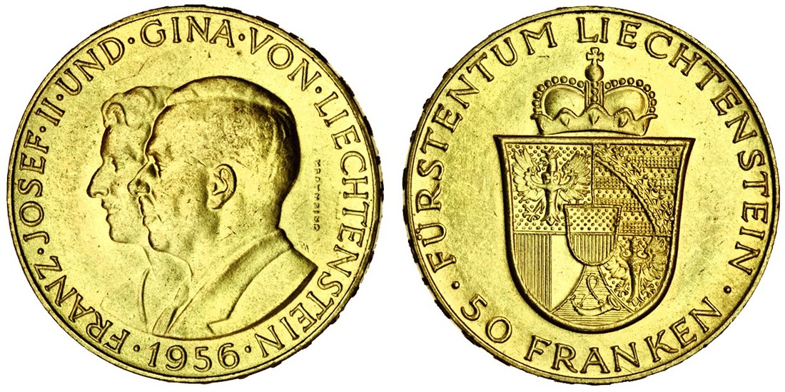 (g) Liechtenstein, Franz Joseph II (1938-90), 50-Franken, 1956, conjoined busts left, rev. crowned arms (F.20; Y.16), extremely fine