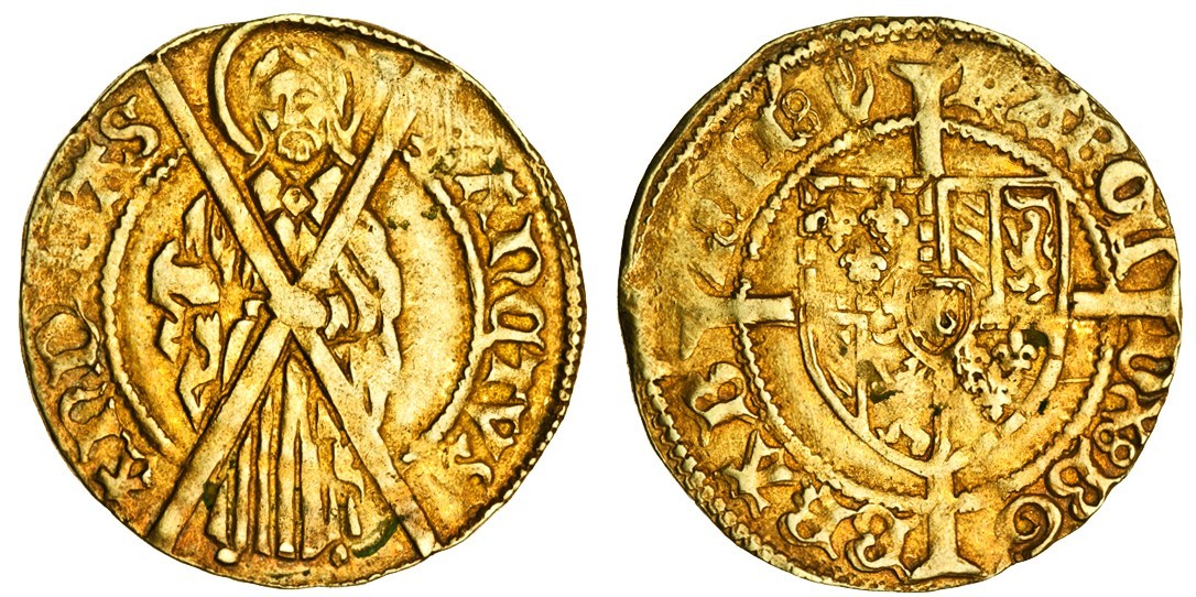 Low Countries, Brabant, Charles le Téméraire (1467-77), Florin de Bourgogne, 3.41g, Antwerp, St Andrew, rev. shield (Del.69; F.33), from a mount, very fine