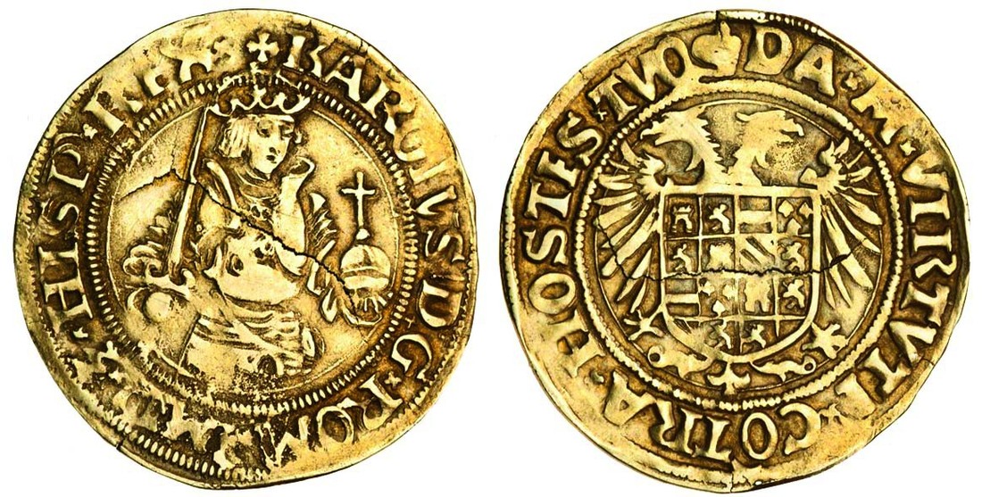 Low Countries, Flanders, Charles V (1506-55), Florin or Carolus d'or, 2.89g, Emperor half-length, holding sword and orb, rev. shield (Del.517; F.207), cracked in centre, good fine