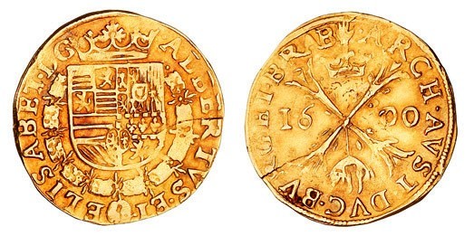Low Countries, Brabant, Albert and Isabella (1598-1621), Albertin or two-third Ducat, 2.87g, 1600, Antwerp, crowned shield within collar of the Golden Fleece, rev. crowned cross of St. Andrew (Fr.89; Delmonte 146; de W. 893/894; v.G.&H.285-1), flan crack, very fine