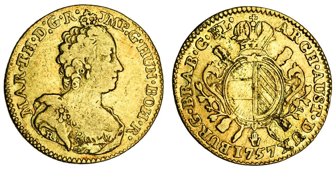 Low Countries, Austrian Netherlands, Brabant, Maria Theresia (1740-80), Souverain d'or, 1757, bust right, rev. oval shield m.m. hand (Antwerp) below (Delm.212; F.135), very fine