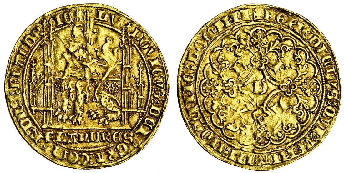 Low Countries, Flanders, Louis de Male (1346-84), Lion heaumé d'or, lvdovicvs dei gra com z dns flandrie, helmeted lion seated, flandres below, rev. benedictvs qvi venit in nomine domini, cross fleury, flan in angles, d in centre (Del.460; F.157), very fine