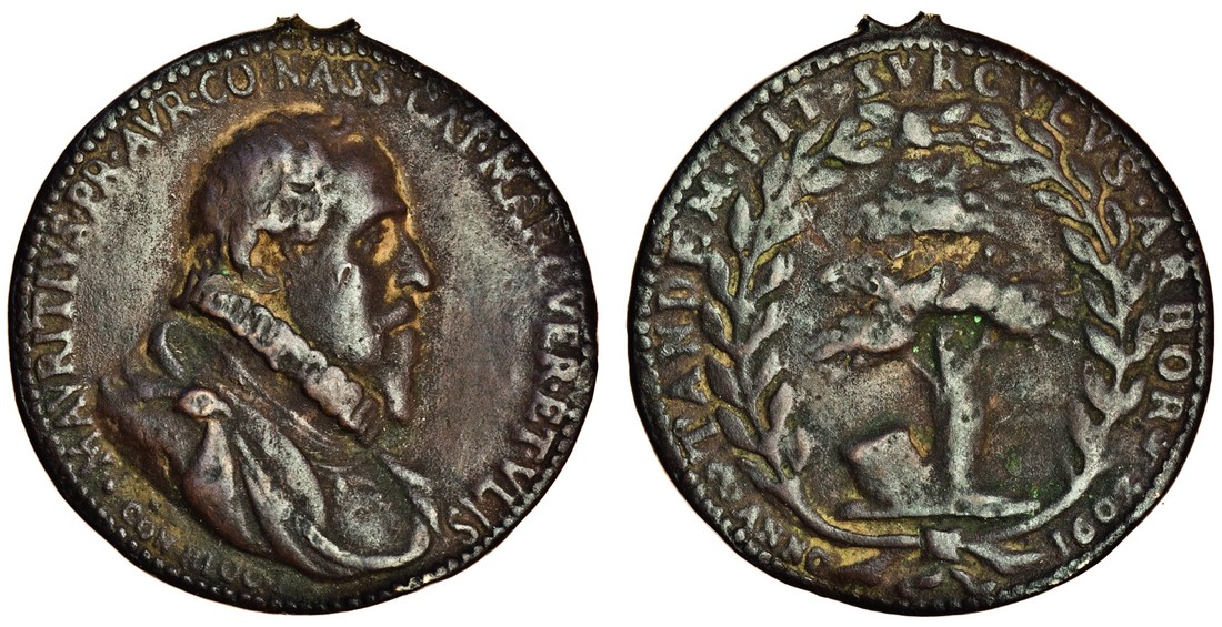 Low Countries, Maurice of Nassau, The Capture of Grave, 1602, cast medal, in bronze, by Conrad van Bloc, 18.15g, draped and cuirassed bust in ruff right, con bloc f below, rev. orange tree growing from a trunk, tandem fit svrcvlvs arbor, anno 1602 (MI i, 180/181), wavy flan, remains of a loop at 12 o'clock, some verdigris, fine
