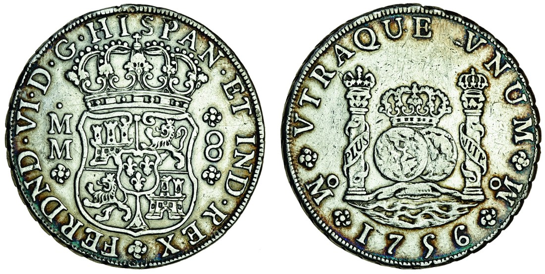 Mexico, Ferdinand IV (1746-59), 8-Reales, 1756 MM, Mexico City, crowned shield dividing assayer's initials and value, rev. crowned globes between crowned pillars (Cal.775; KM.104.2), cleaned, very fine
