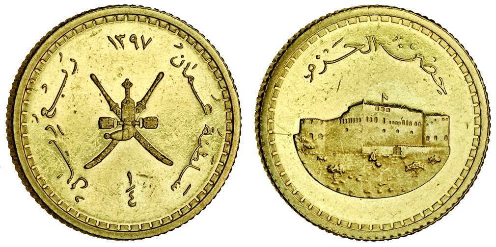 (x) Oman Qabus bin Sa'id, proof gold piefort 'presentation striking', 13.84g, 1/4-Dinar, 1976, National arms, rev. Fort al Hazam, milled edge (KM 57), light scuffs but uncirculated, scarce