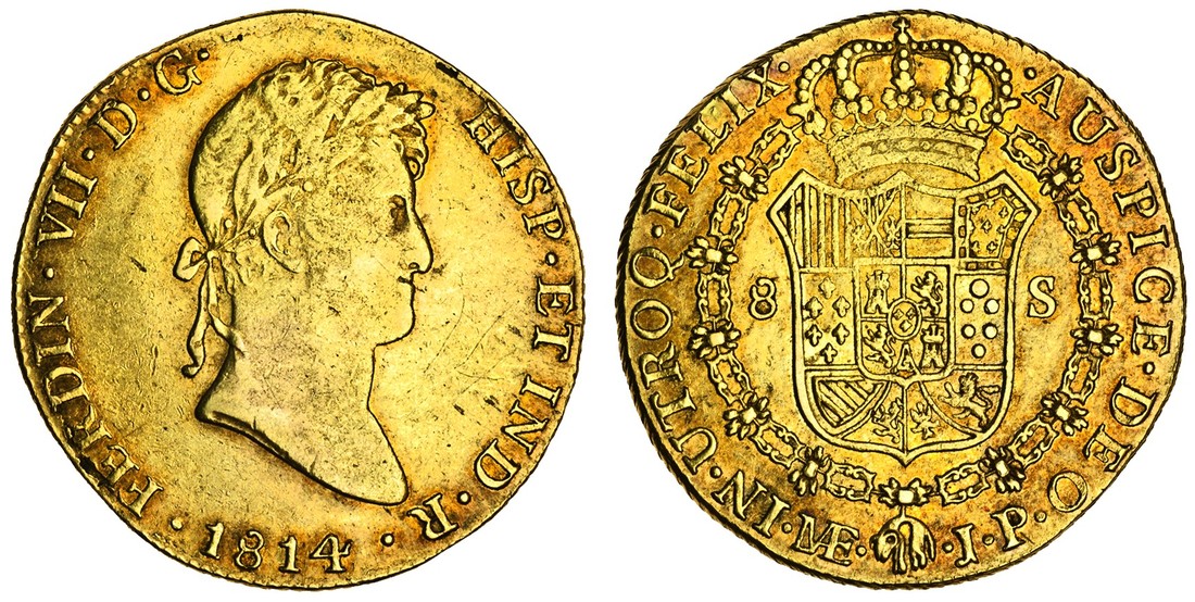 (g) Peru, Ferdinand VII (1808-21), 8-Escudos, 1814 JP, Lima, laureate head right, rev. crowned shield (F.54; KM.129.1), toned around legend, some lustre, graffiti before face, very fine