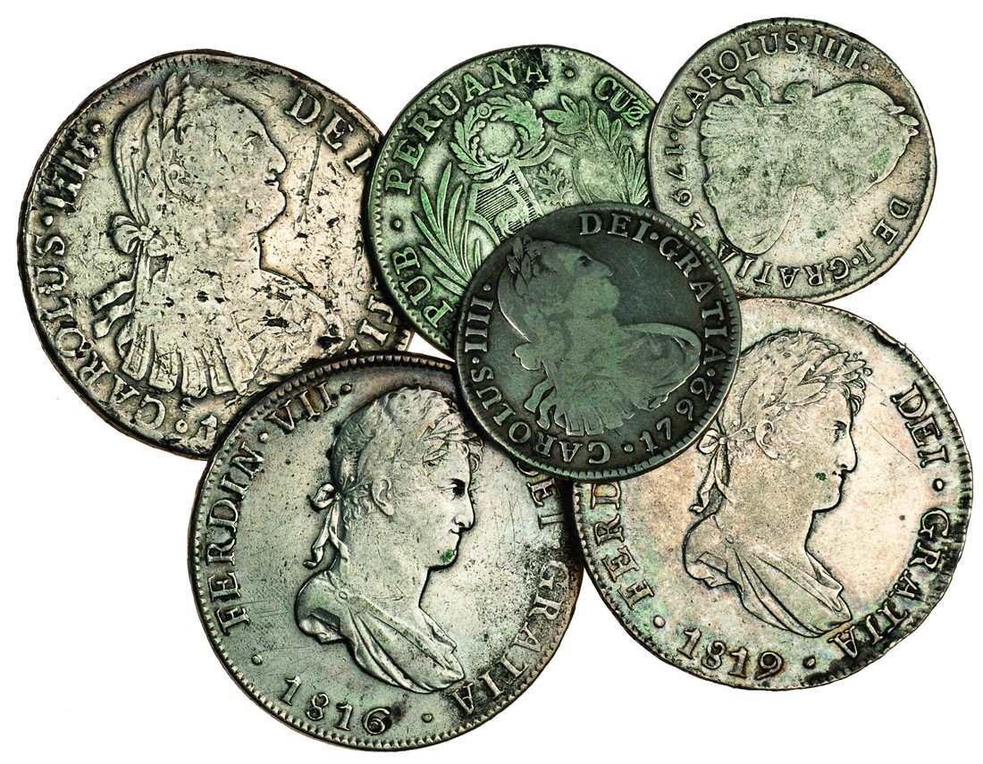 Peru, silver coins (6), 8-Reales (3), 1805, 1816, 1819, 2-Reales (2), 1792, 1793, all Lima, and 4-Reales, 1836 B, Cuzco, some signs of mounts, fine to very fine (6)