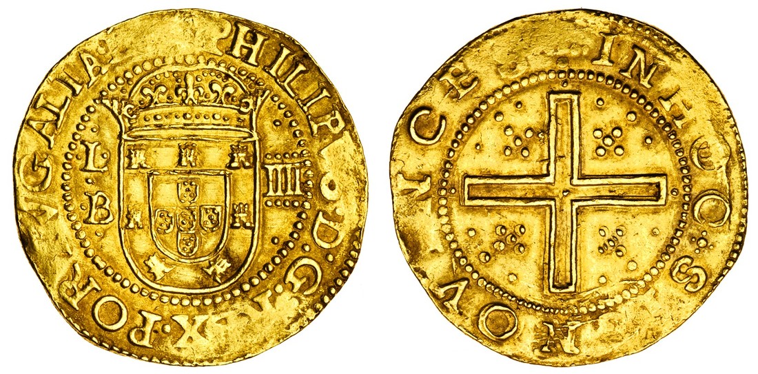 Portugal, Filipe III (Philip IV of Spain) (1621-40), 4-Cruzados, 12.14g, undated, philipvs. d: g: rex. portvgalia. e(-), crowned shield, lb to left with six pellets in field, IIII to right with pellets at both ends of each numeral, and one pellet in each field above and below, rev. in hoc . signo vinces, cross with pellet at centre and single pellet at each extremity, five pellets in a square formation in angles, and a further three pellets around the edge of each angle (F.56; Gomes -, cf 6.01 for similar reverse; KM 18), four areas of flatness in the legends possibly where held in a mount, otherwise extremely fine, very rare