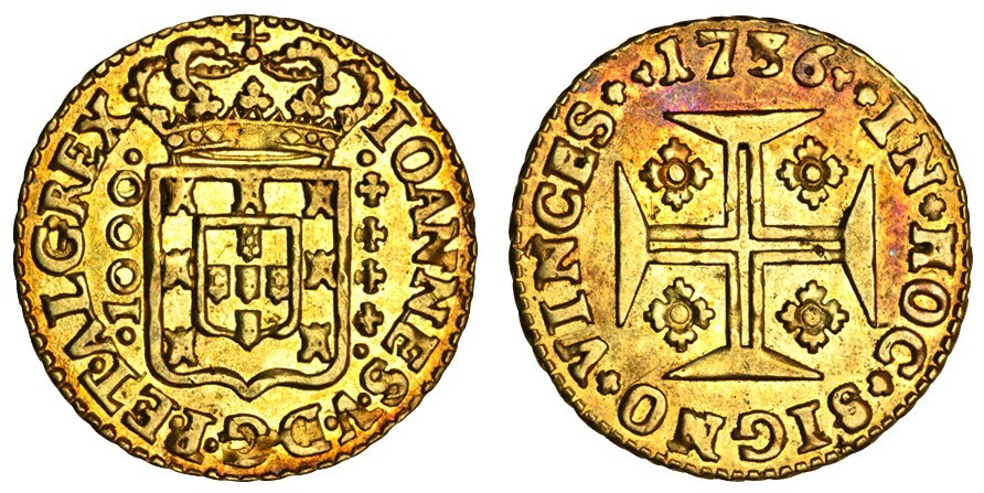 Portugal, João V (1706-50), 1,000-Reis (Quartinho), 1736, crowned shield, rev. cross (F.98; KM 182), good very fine
