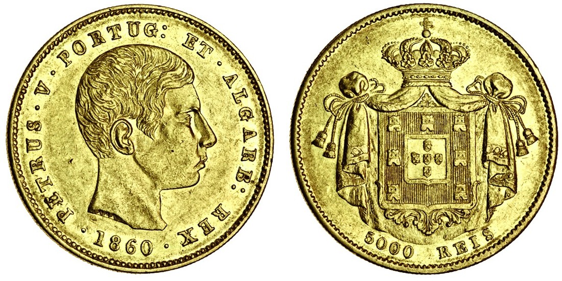 (g) Portugal, Peter V (1853-61), 5000-Reis, 1860, head right, rev. crowned arms (F.147; KM.505), marks on edge, lustre around legend, some marks on obverse, extremely fine