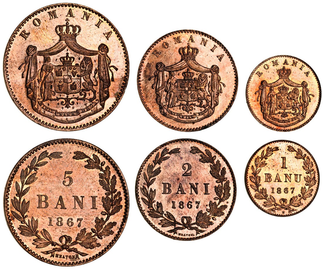 Romania, Carol I (prince 1866-81, king 1881-1914), 5-Bani, 2-Bani, 1-Ban, all 1867 Heaton mint specimens, arms, rev. value in wreath (KM.3.1, 2.1, 1.1), brilliant uncirculated (3)
