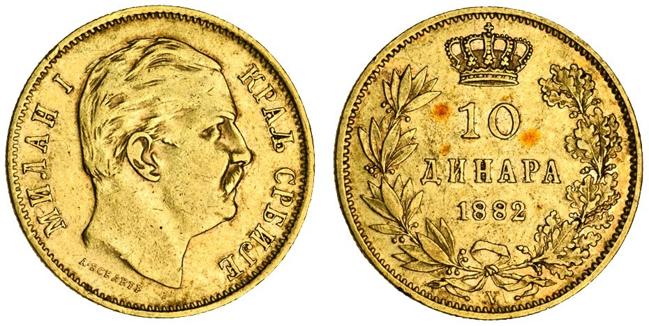 Serbia, Milan Obrenovich IV (1868-89), 10-Dinara, 1882, head right, rev. value and date in wreath (F.5; KM 16), very fine