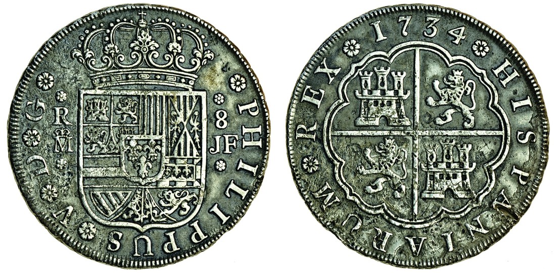Spain, Philip V (1700-46), 8-Reales, 1734 JF, Madrid, crowned shield, rev. cross, lions and castles in angles (Cal.478; KM.336.2), water worn in places, good very fine