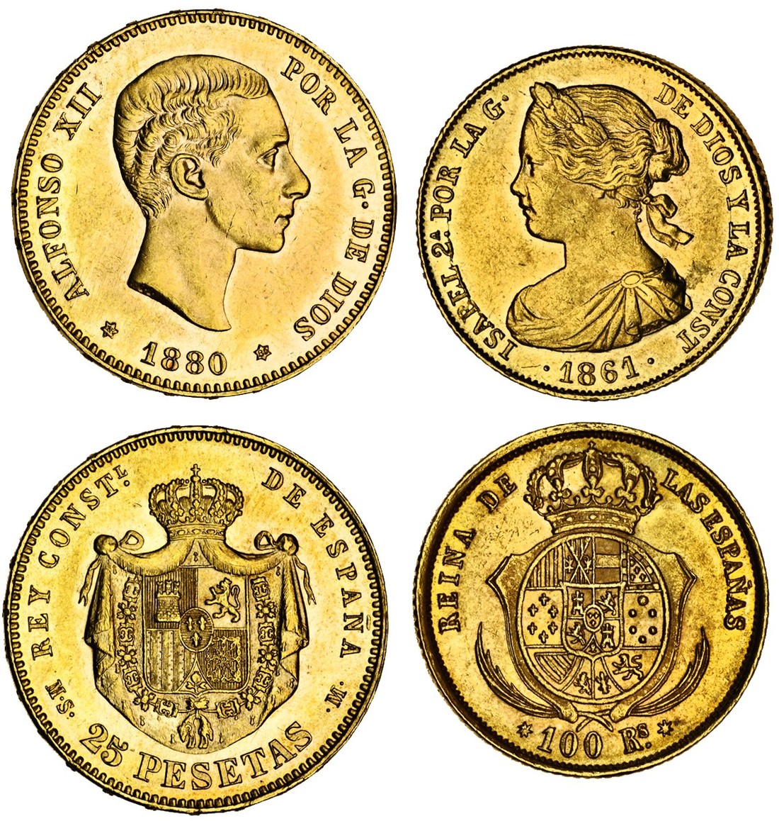 (g) Spain, Isabel II (1833-68), 100 Reales, 1861, Seville, bust left, rev. crowned arms within palms (F.331; KM.605.3), about extremely fine, Alfonso XII (1874-85), 25 Pesetas, 1880, MS-M, head right, rev. crowned arms (F.342; KM.673), lustre, marks to face and in fields, extremely fine (2),