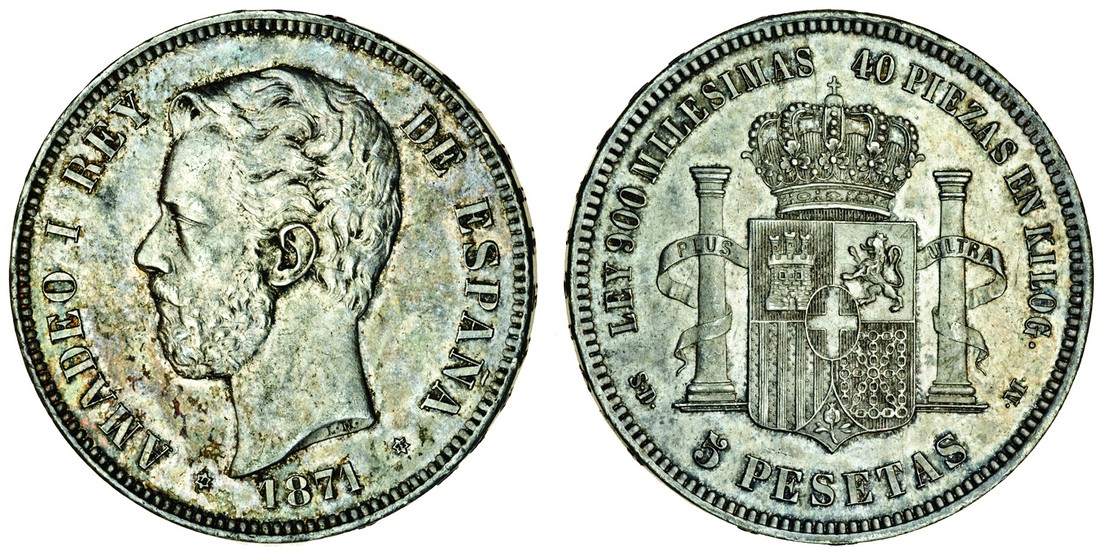 (x) Spain, Amadeo I (1871-73), 5-Pesetas, 1871 (71) SD, head left, rev. crowned arms (Cayon 16529; KM.666), extremely fine