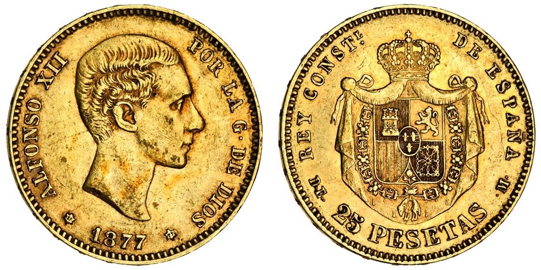 (g) Spain, Alfonso XII (1874-85), 25-Pesetas, 1877 (1877 in stars), Madrid, head right, rev. crowned arms (F.342; KM 673), very fine