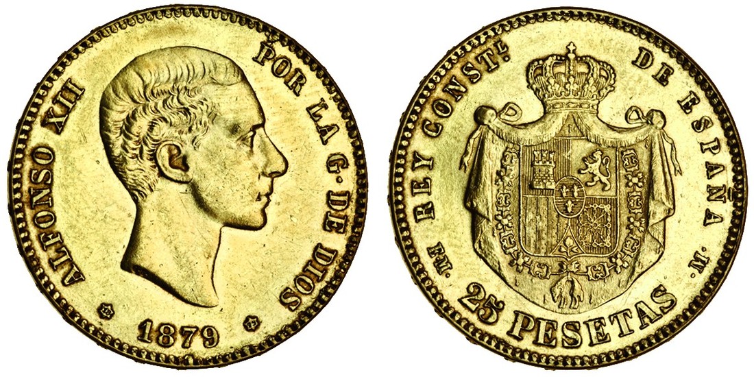 (g) Alfonso XII (1874-85), 25-Pesetas, 1879 (79), EM-M, head right, rev. crowned arms (F.342; KM.673), hairlines, marks on edge, good very fine