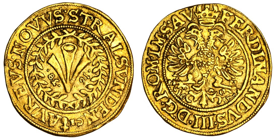Sweden, Christina (1637-54), Stralsund under Sweden, Ducat, 1638 CS, 3.44g, in the name of Ferdinand III, city arms dividing date within wreath, rev. crowned double-headed eagle, (AAJ 1; F.3368; KM.102), from a mount, very fine