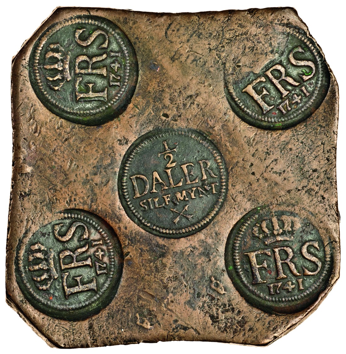 Sweden, Frederik I (1720-51), 1/2 Daler, 1741, copper plate money, central stamp with value, four corner stamps with crowned initials and date, approx. 97 x 98 mm (AAH 293; KM.PM65), clipped corners, one stamp weak on crown, very fine