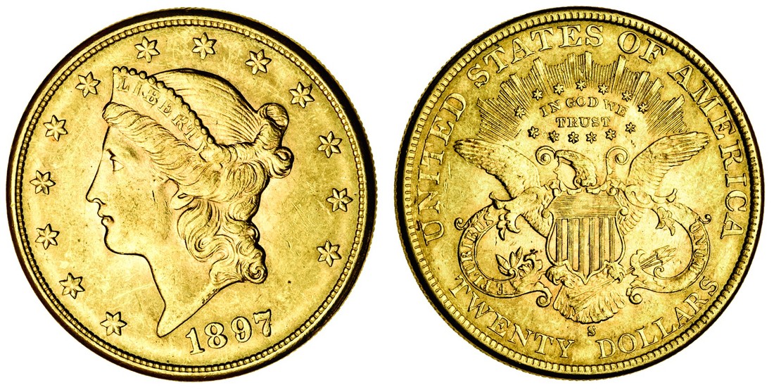 (g) United States of America, 20-Dollars, 1897 S, Liberty head left, rev. eagle with shield, possibly from a mount, good very fine