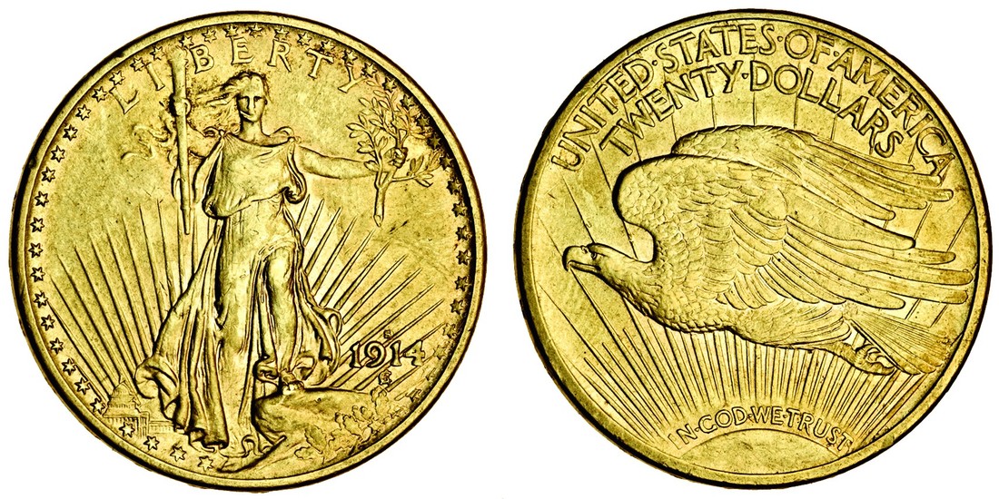 (g) United States of America, 20-Dollars, 1914 S, Liberty standing, rev. eagle, possibly from a mount, scratch to Liberty's face, very fine