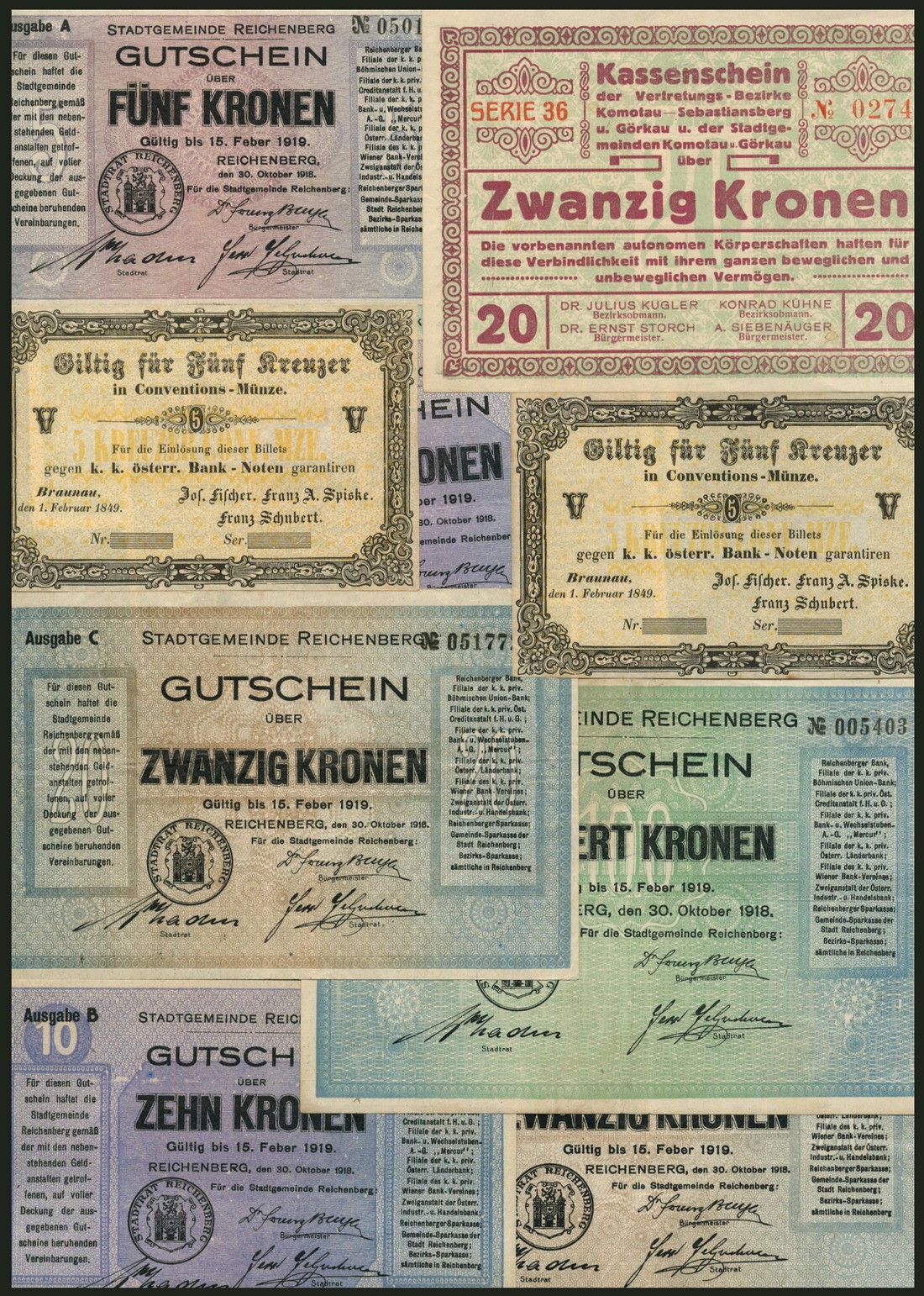 Reichenberg District Parish, Austria, 5, 10 (2), 20 (2), 100 (2) kronen, 15 February 1919, 5 Kreuzer (2), 1 February 1849, black on yellow, also 20 kronen, 15 November 1918, serie 36