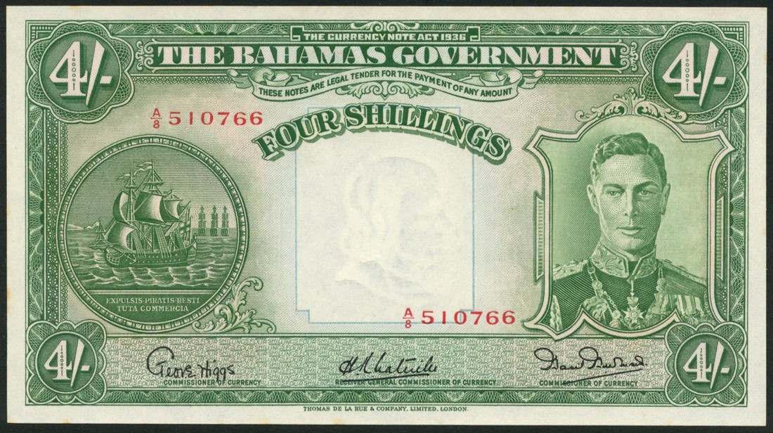 (x) The Bahamas Government, 4 Shillings, Law of 1936 (1947), serial number A/8 510766, signatures Higgs Latreille and Burnside, signature title Commissioner of Currency, green, King George VI at right, ship seal at left, reverse coat of arms at left, value in ornate guilloche at right