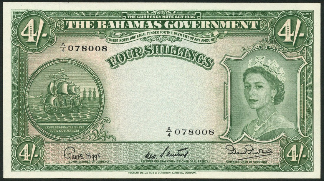 (x) The Bahamas Government, 4 Shillings, ND (1953), serial number A/4 078008, signatures Higgs Sweeting and Burnside, green, Queen Elizabeth II at right, ship seal at left, reverse coat of arms at left, value in ornate guilloche at right