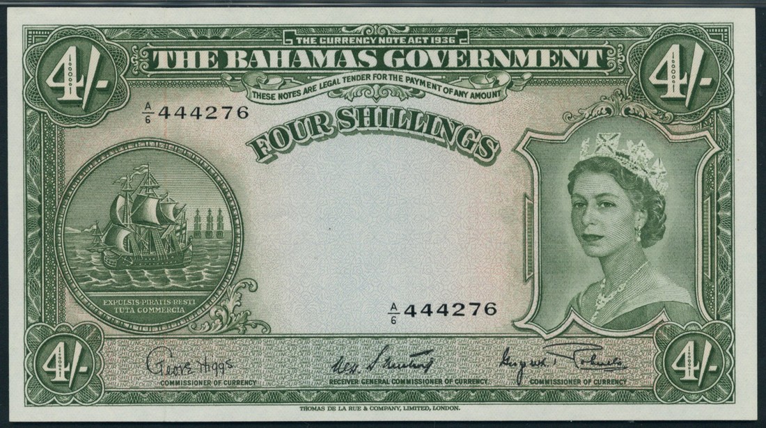 The Bahamas Government, 4 shillings (2), ND (1953), serial numbers A/6 444276/277, green, Elizabeth II at right, ship seal at left, Sweeting and Roberts signatures