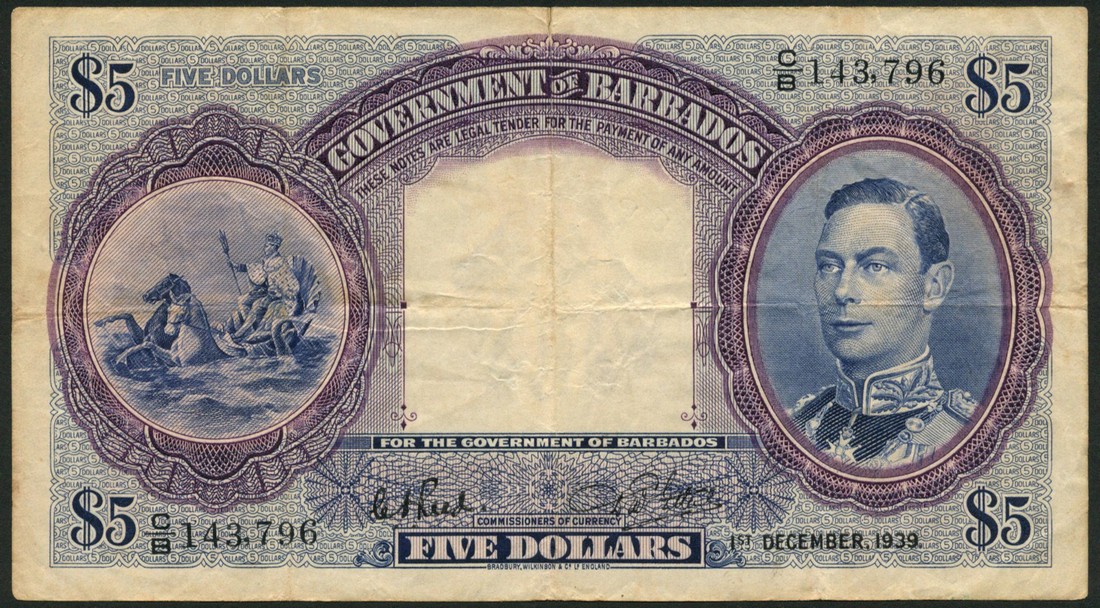 (x) Government of Barbados, $5, 1 December 1939, serial number C/B 143,796, purple and blue, King George VI at right, Neptune riding chariot at left, reverse red, green and multicoloured, ornate geometric patterns