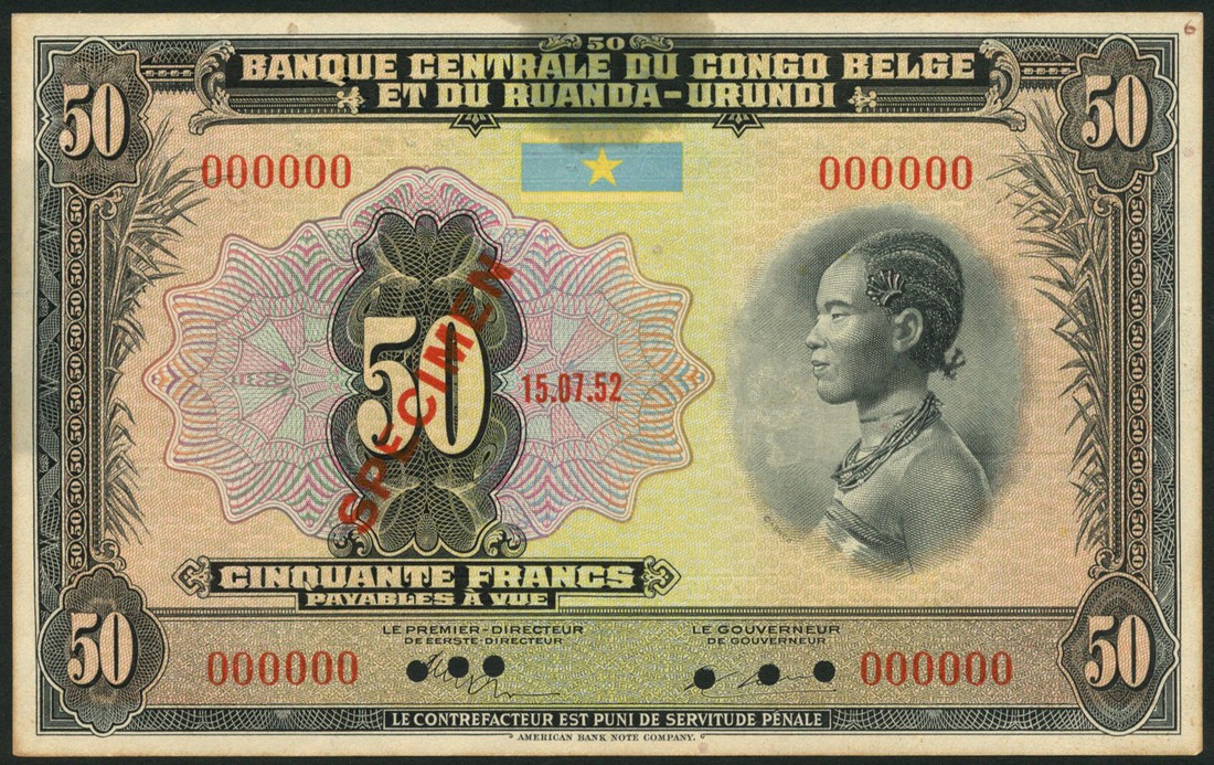 Banque Centrale du Congo et du Ruanda-Urundi, specimen 50 francs, 15 July 1952, red zero serial numbers, black and multicoloured, young girl at right, reverse black, leopard at centre
