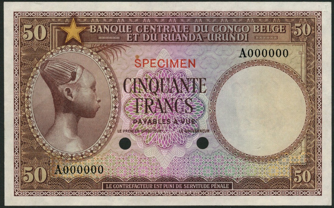 (†) Banque Centrale du Congo Belge et du Ruanda-Urundi, specimen colour trial 50 Francs, ND (c1953), serial number A000000, no signatures, brown on purple and green underprint, portrait of a young woman at left, value in each corner, yellow star at upper left, reverse two fishermen carrying net, river landscape in background, overprinted SPECIMEN in red on obverse and reverse, two punch holes