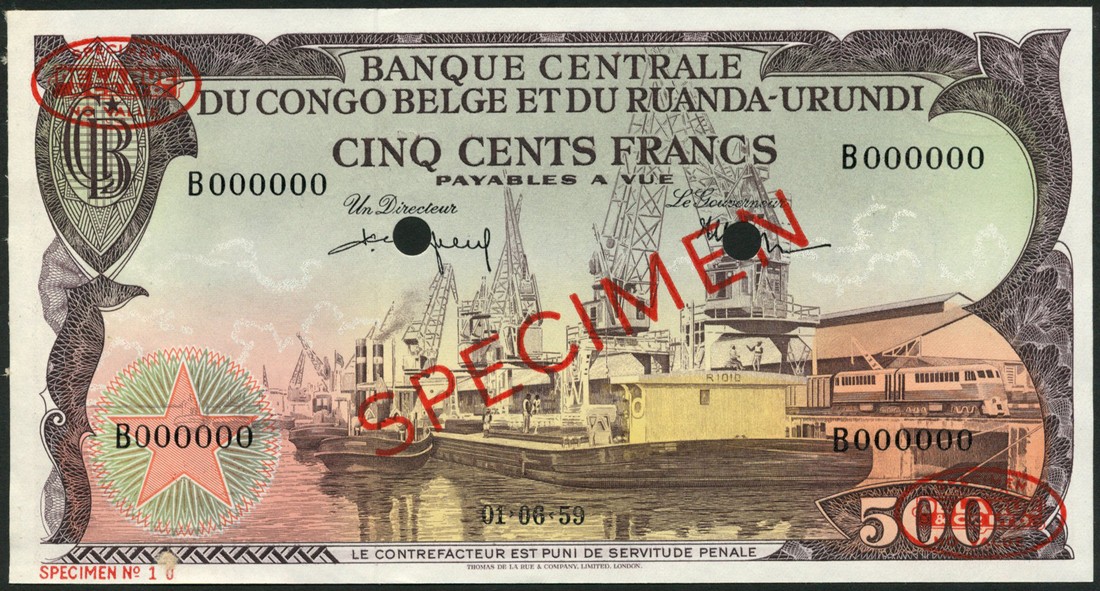 (†) Banque Centrale du Congo Belge et du Ruanda-Urundi, specimen 20 Francs, 1 June 1959, serial number AM000000, green on multicoloured underprint, young boy at left, reverse river landscape at left, young girl at right; specimen 500 Francs, 1 June 1959, serial number B000000, brown on multicoloured underprint, ships at dockside, reverse man in dugout canoe, both overprinted SPECIMEN in red with two De La Rue specimen ovals on obverse and reverse, two punch holes