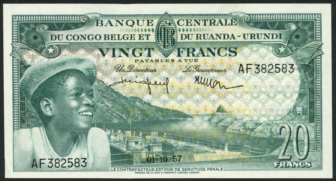 Banque Centrale du Congo Belge et du Ruanda-Urundi, specimen 20 francs, 1December 1956, serial number A 000000, green, pale yellow, boy at left, dam at right, reverse green, child at right, rapids, also an issued example, serial number AF382583