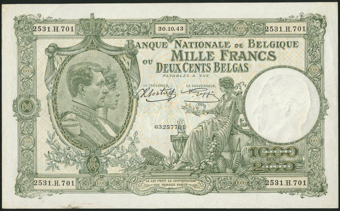 Banque National de Belgique, 1000 francs or 200 belgas (9), 30 October 1943, serial number 2531.H.701-709, green on multicolour underprint, King Albert and Queen Elizabeth at left