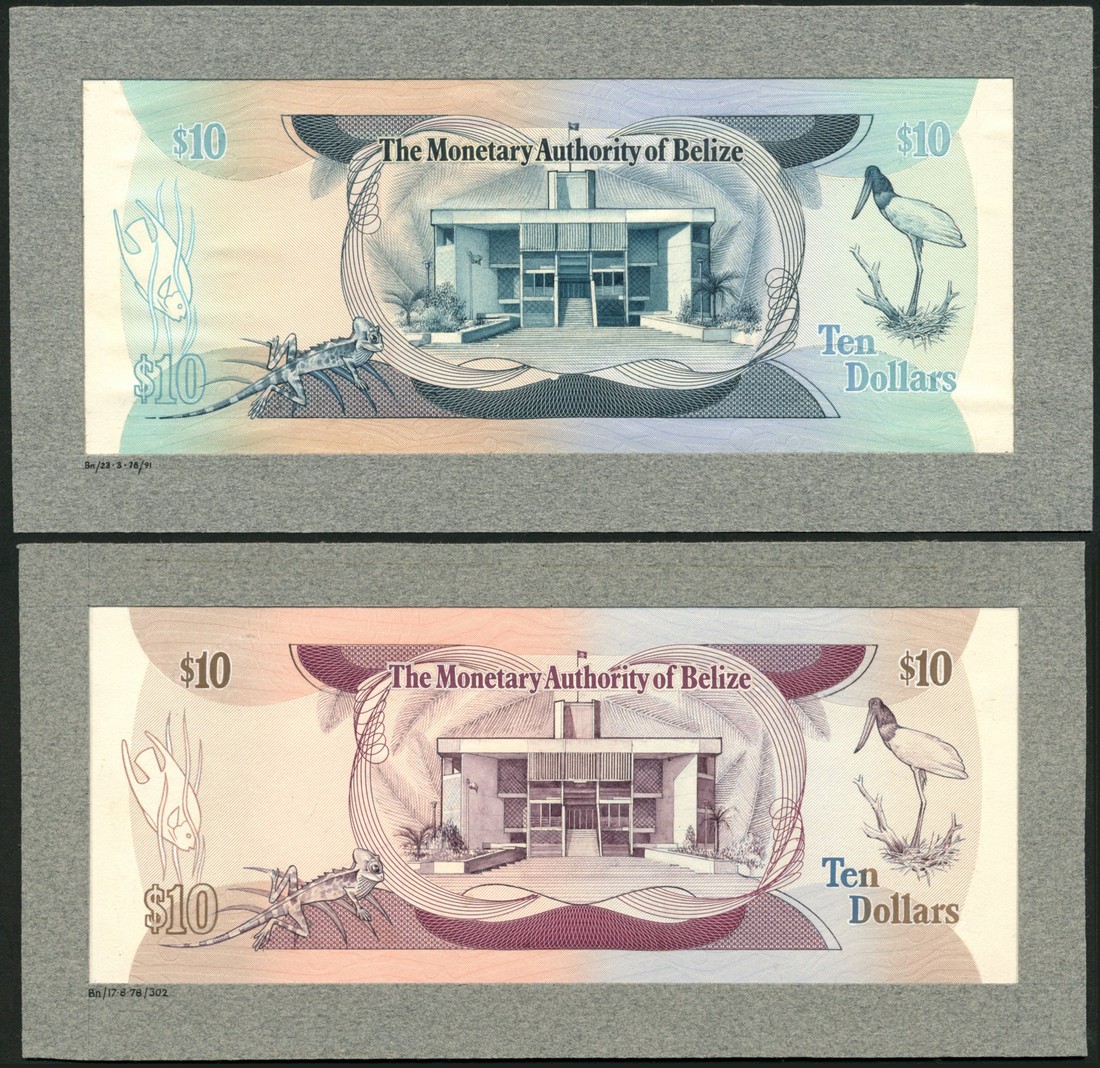 (†) The Monetary Authority of Belize, two reverse composite essays on card for a $10, ND (ca1978), the first purple and multicoloured and the second blue and multicoloured, both House of Representatives at centre, Jabiu Stork at right