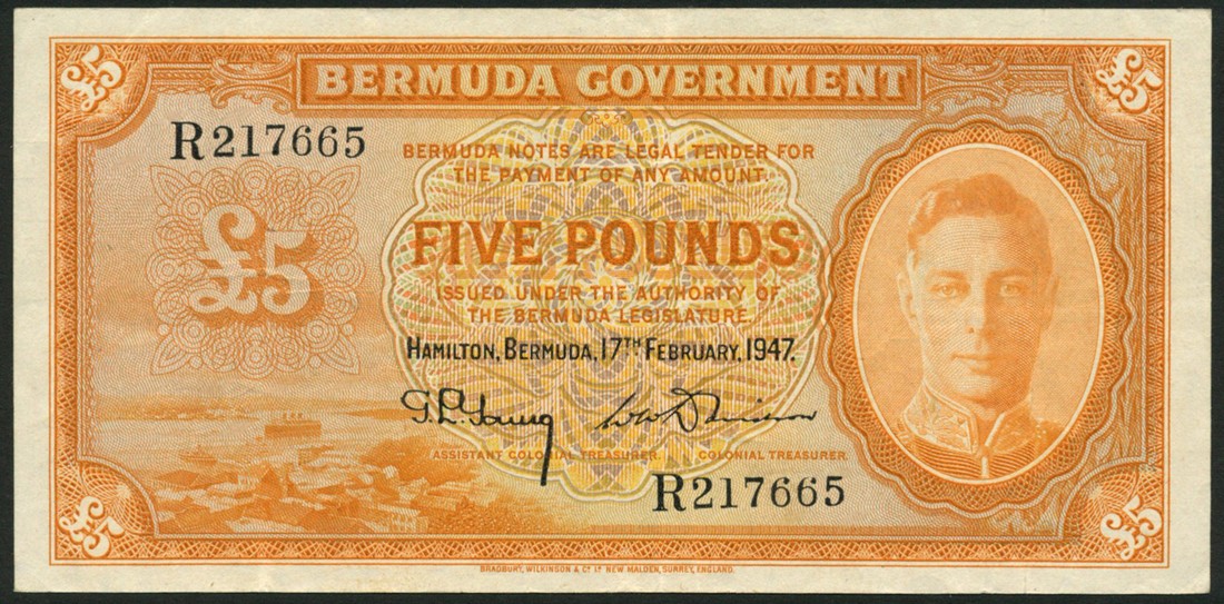 (x) Bermuda Government, £5, 7 February 1947, serial number R 217665, orange and pale green, King George VI at right, cruise ship "The Monarch" in Hamilton Harbour at lower left, reverse coat of arms at centre, value in guilloches at left and right