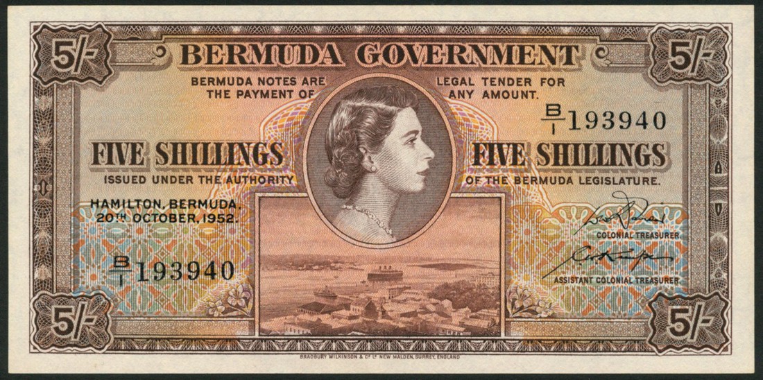 (x) Bermuda Government, 5 Shillings, 20 October 1952, serial number B/1 193940217665, brown, purple and pale green, Queen Elizabeth II at upper centre, cruise ship "The Monarch" in Hamilton Harbour at lower centre, reverse coat of arms at centre, value in guilloches at left and right