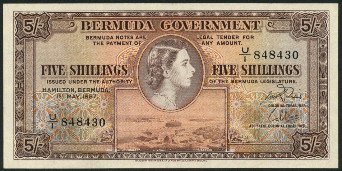 Bermuda Government, 5 shillings, 1 May 1957, serial number U/1 848430, brown on multicolour, Queen Elizabeth II at centre, reverse lilac and green, Royal Crest at centre