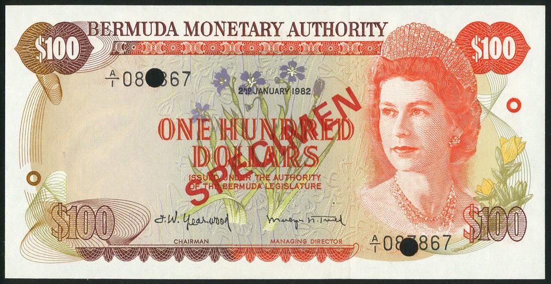 Bermuda Government, group of 10 specimen dollar notes of various denominations all featuring Queen Elizabeth II at right, stamped SPECIMEN obverse and reverse, hole punched,