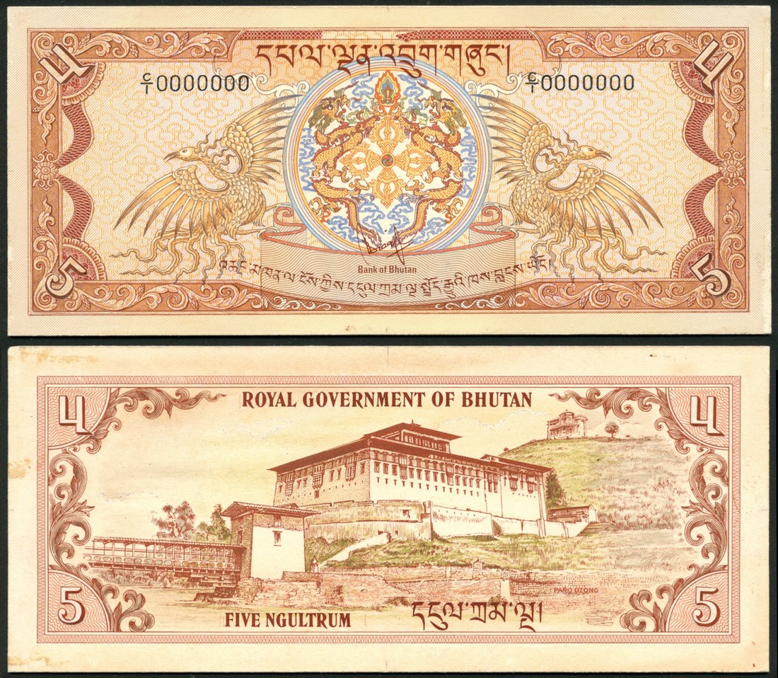 (†) Royal Government of Bhutan, an obverse and reverse composite essay for a 5 ngultrum, ND (1978), serial number C/1 0000000, dark and pale pink-brown, dragons and Royal emblem at centre, bird (bja tshering) at left and right, reverse brown, green and white, the Paro Dzong Palace at centre