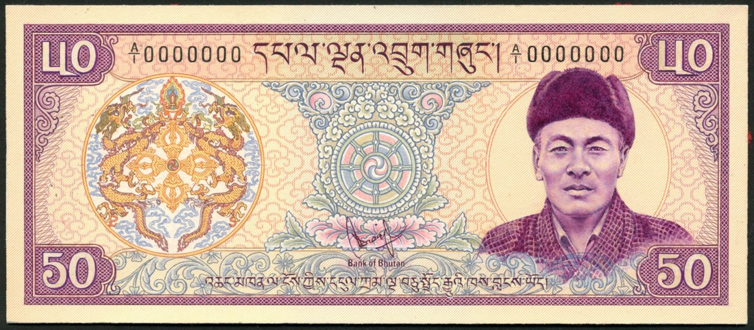 (†) Bank of Bhutan, an obverse composite essay for a 50 ngultrum, ND (1981), violet and multicoloured, Jigme Dorji Wangchuk at right, dragons and seal at left