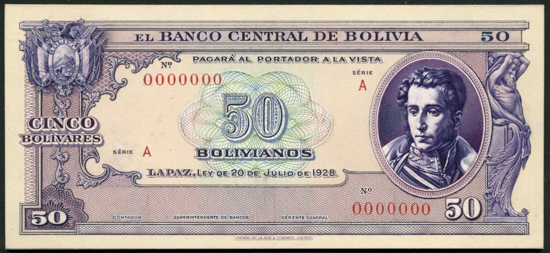 (†) Banco Centrale de Bolivia, an obverse composite essay on card for a 50 Bolivianos, Law of 20 July 1928, Serie A, serial number 0000000, purple and green on cream underprint, portrait of Antonio Jose de Sucre at right, arms at top left