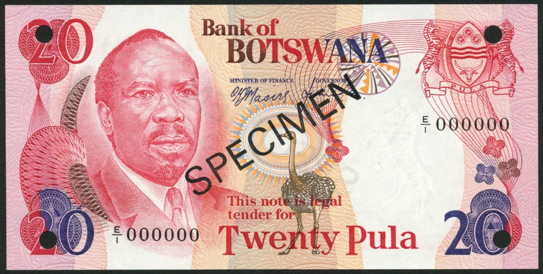 Bank of Botswana, a group of specimen notes comprising 1, 2, 5, 10, 20 Pula, ND (1976), and 1 Pula ND (1983), all zero serial numbers and stamped red SPECIMEN on obverse and reverse, hole punched in each corner, with the majority of notes depicting rural agricultural scenes on the reverse