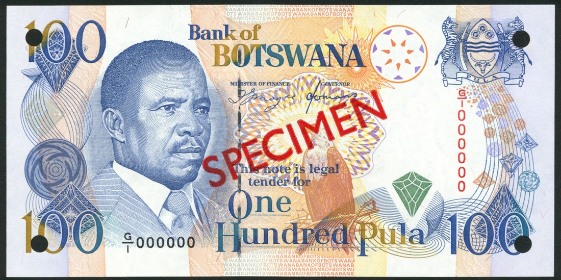 Bank of Botswana, specimen 50 and 100 pula notes, ND (1993), zero serial numbers, brown on multicolour underprint, President Masire at right, kingfisher at centre, red stamped SPECIMEN obverse and reverse, hole puched at each corner, blue on multicolour underprint, President Masire at right, fish eagle centre, red stamped SPECIMEN on obverse and reverse, hole puched at each corner